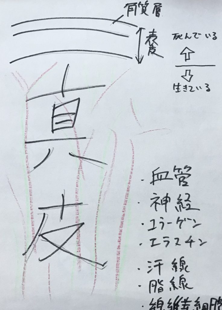 真皮は生きている。血管やら何やらがあって正に身体の一部と言っていい。表皮の10~20倍分厚い。